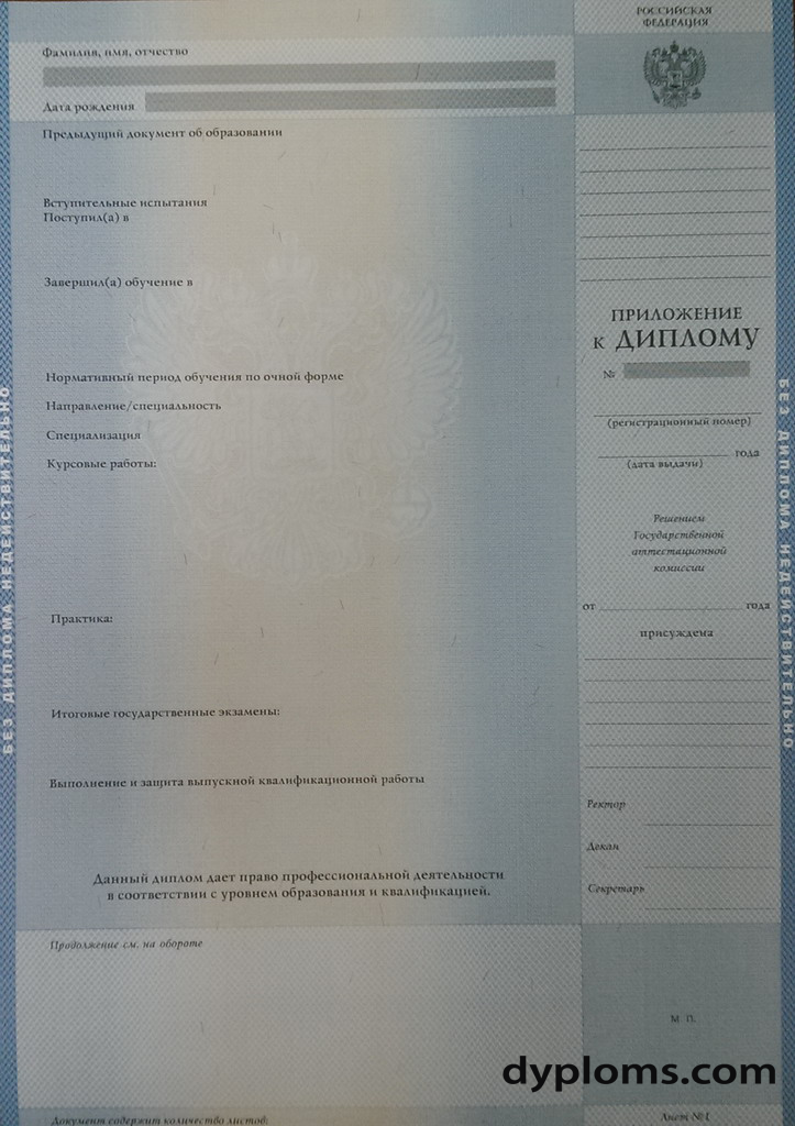 Наша компания осуществляет изготовление дипломов любых высших учебных заведений России с присвоением квалификаций "бакалавр", "специалист" или "магистр". Доступно оформление документов с отличием. При заказе диплома о высшем образовании 2004-2009 годов вы гарантированно получаете: